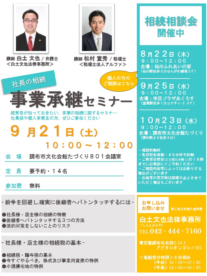 松村宣秀税理士(税理士法人アルファ)と弁護士白土の2名による、事業承継セミナー及び無料相続相談会を以下の日程で開催致します。